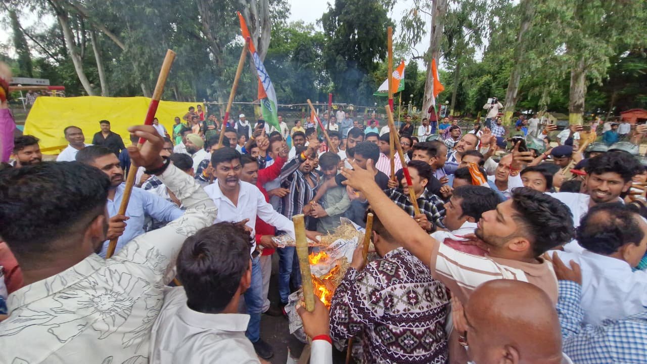 किसान आंदोलन के बाद से सदमें में पहुंची भाजपा ने कांग्रेस कार्यालय के सामने नेता विपक्ष श्री राहुल गांधी का पुतला दहन कर राजनीतिक व सामाजिक फिजा में जहर घोलने का पूरा प्रयास किया। इस षड्यंत्र में पुलिस व प्रशासन के चंद अफसरों ने भाजपा के कार्यकर्ता बनकर काम करते हुए खूब पैरवी की, किन्तु अन्याय के खिलाफ कांग्रेस के एकजुट हुए पदाधिकारियों व कार्यकर्ता नहीं झूके। भाजपा सांसद के इशारों पर मुजरा करने वाले कलेक्टर और पुलिस अधीक्षक ने कांग्रेस कार्यालय को पुलिस छावनी में तब्दील कर पूरा प्रयास किया कि भाजपा अपने मंसूबों में कामयाब हो जाए, किन्तु कांग्रेस के समस्त पदाधिकारियों व कार्यकर्ताओं ने हर षड्यंत्र का डटकर सामना किया। वोट चोर गद्दी छोड़ के लगे गगन भेदी नारे: कांग्रेस के जबांज साथियों ने कांग्रेस कार्यालय के सामने वोट चोर गद्दी छोड़ के गगन भेदी नारों से तिलमिलाई और छटपटाई भाजपाइयों ने अपना इरादा बदल दिया। पुलिस और प्रशासन के सारे बल प्रयोग विफल हुए और कांग्रेस ने खुलकर ईएलसी चौक पर डंके की चोट पर प्रधानमंत्री नरेन्द्र मोदी, गृहमंत्री अमित शाह और मुख्यमंत्री मोहन यादव का पुतला पुलिस और प्रशासन की नाक के नीचे फूंककर एक बार फिर साबित कर दिया कि कांग्रेस जब अंग्रेजों के सामने नहीं झुकी तो चोरों के सामने कैसे झुक सकती है।